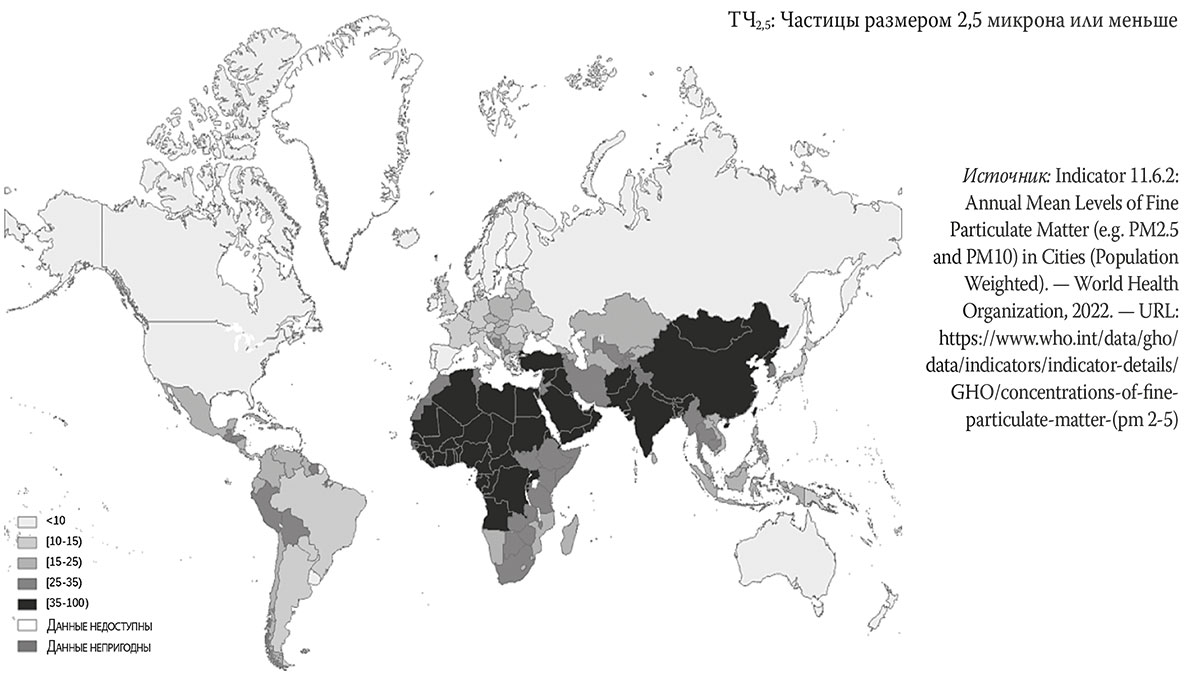 Рис. 2. Глобальная карта концентрации ТЧ2,5, в мкг/м3