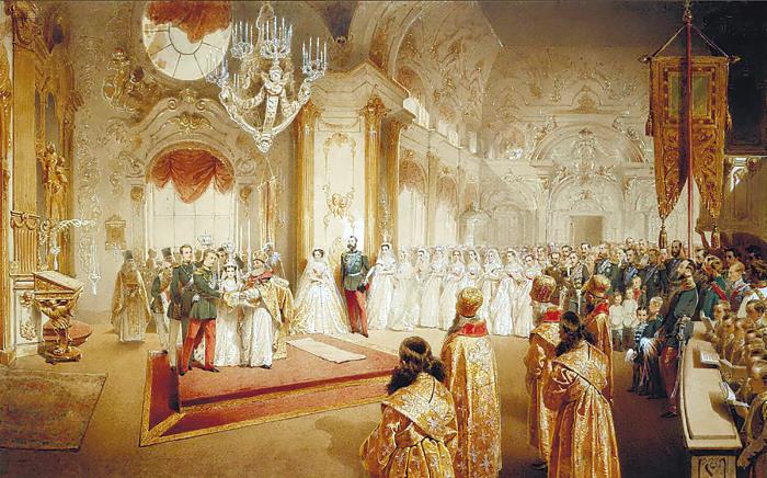 28 октября (9 ноября) 1866 года состоялось торжественное бракосочетание великого князя Александра Александровича и великой княжны Марии Федоровны. В восемь часов утра со стороны Петропавловской крепости прогремели пять пушечных выстрелов, возвещавших об этом знаменательном событии в истории России. К двенадцати часам дня в Зимний дворец съехались члены Святейшего синода и придворное духовенство, члены Государственного совета, сенаторы, статс-дамы, камер-фрейлины, гофмейстерины, фрейлины, придворные чины и кавалеры, чужестранные послы и посланники, генералы армии и флота.