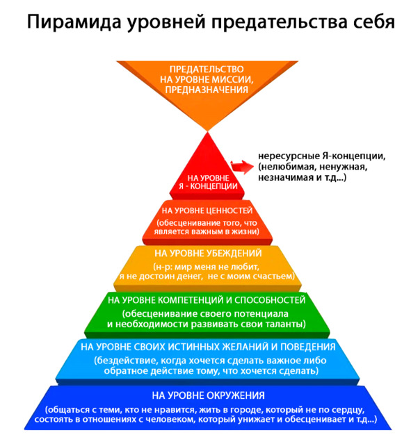 • Предательство себя может происходить на семи уровнях: на уровне миссии, Я-концепций, значимых ценностей, убеждений, способностей, поведения и окружения.
