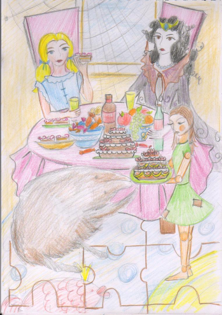 Она хлопнула в ладоши, и в обеденный зал вошла маленькая девочка. Девочка налила в бокал королевы лимонад и отправилась к Маше.