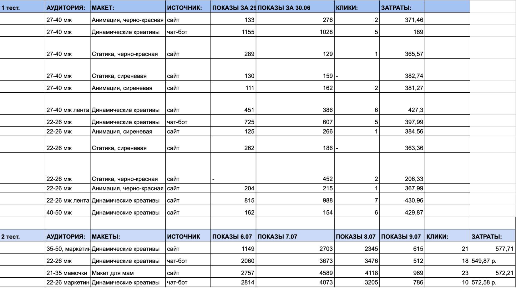 ⁃ С одним таргетологом будем прощаться, там слив бюджета идёт, и неожиданно девушка, которая делала рекламные креативы настроила кампанию и привела нам 10 клиентов с бюджетом 932 рубля по цене 93,2 рубля (будем смотреть дальше на рекламе вебинара на 5 августа, чтобы подтвердить, что это не совпадение);