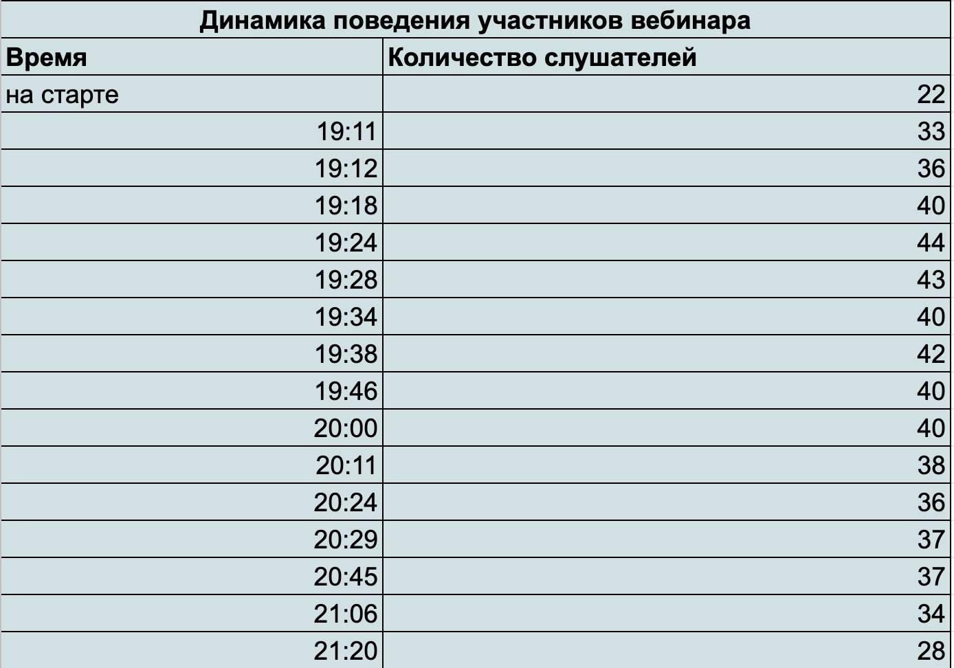 ⁃ необходимость сокращения количества времени на проведение вебинара до 1-1,5 часов + ответы на вопросы (сейчас это 2 часа вебинар и 30 минут ответы на вопросы) – даже несмотря на то, что достаточно хорошо получалось удерживать аудиторию – время надо сокращать;