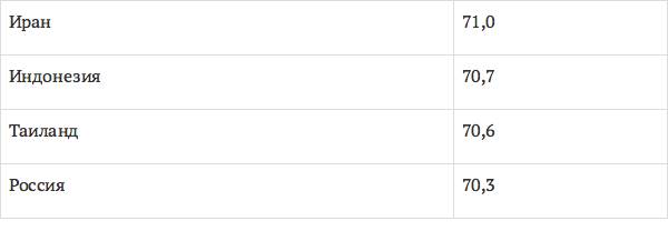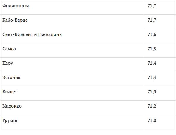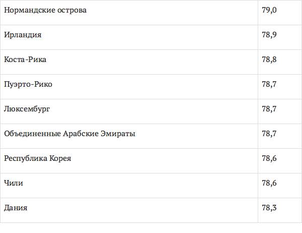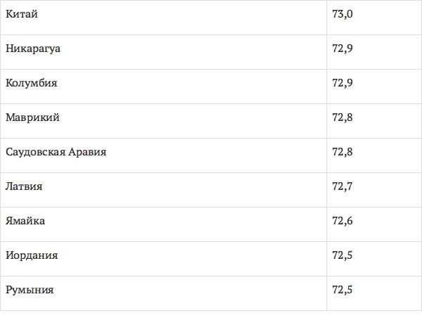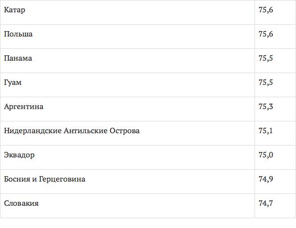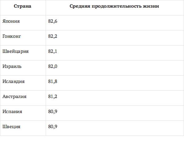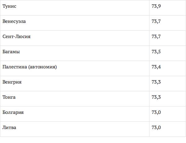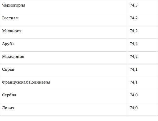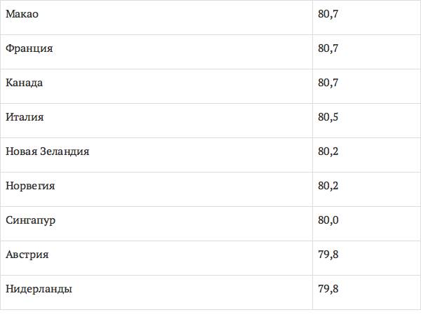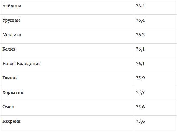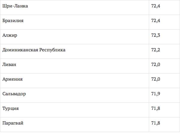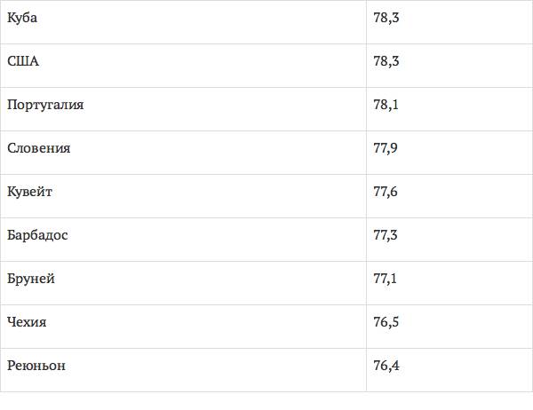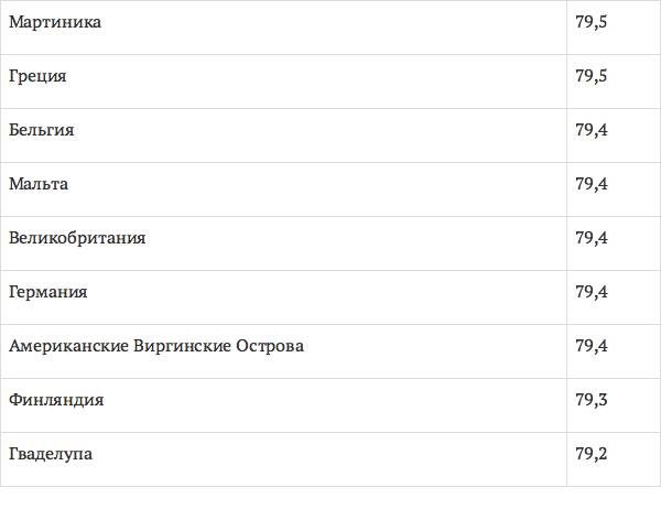 Интересно, что о некоторых из представленных в таблице стран я, например, ничего не слышал. Прошу извинить мое невежество, только из этой таблицы я узнал, что есть такая страна Мартиника (находится в центральной части архипелага Малых Антильских островов в Карибском море Атлантического океана), жители которой живут в среднем до 79,5 лет, что существует страна Бруней (полное название Государство Бруней-Даруссалам), которая находится на северо-западном берегу острова Борнео в Юго-Восточной Азии и омывается Южно-Китайским морем, где люди живут до 77,1 лет.