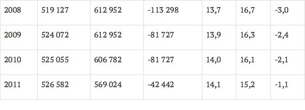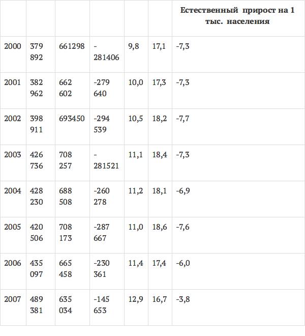 Думаю, не будет преувеличением сказать, что проблема избыточного употребления алкоголя гражданами Российской Федерации напрямую влияет на демографическую ситуацию в стране. В этой связи будет совсем не лишним напомнить, как обстоит у нас дело с рождаемостью. На нижеприведенной таблице наглядно видно, что россияне до последнего времени весьма серьезными темпами вымирали.