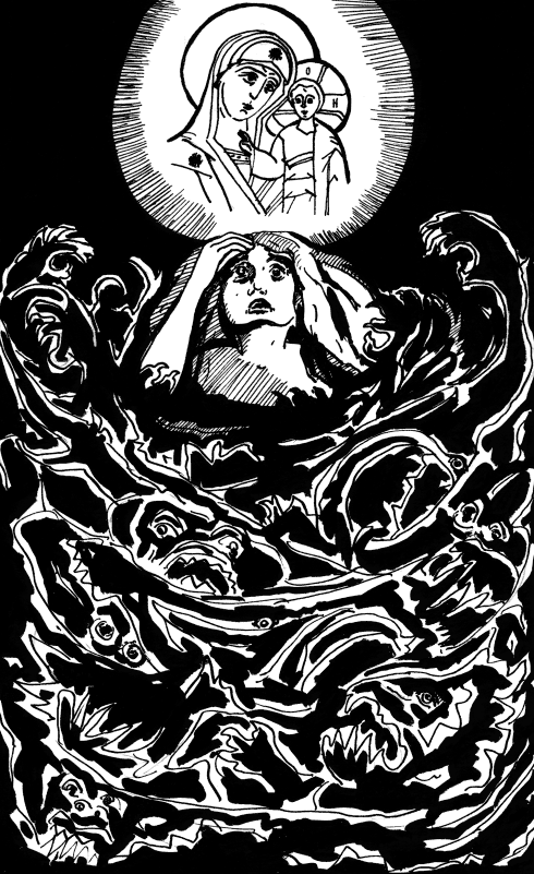 В ту же секунду моя голова освободилась, хотя тело оставалось по-прежнему облепленным бесами. Теперь я смогла повторить свою молитву вслух, сначала сдавленным шепотом, преодолевая страшное напряжение в области горла, языка и губ, а потом громче, выдавливая по слогам: «По-мо-ги…»