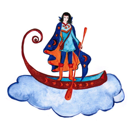 Мила, Андрей и полузамерзший Макс моментально обернулись на голос. Их взору предстал высокий, симпатичный, улыбающийся юноша в темно-синем костюме, расшитом золотыми звездами и полумесяцами. Изящно уложенные черные волосы, волной спадающие на плечи, были обрамлены золотым обручем, на плече висела потертая холщовая сумка, которая никак не подходила к костюму, а сам он стоял на небольшой лодочке (также украшенной звездами и полумесяцами), держа в руках тонкое, резное золотое весло.