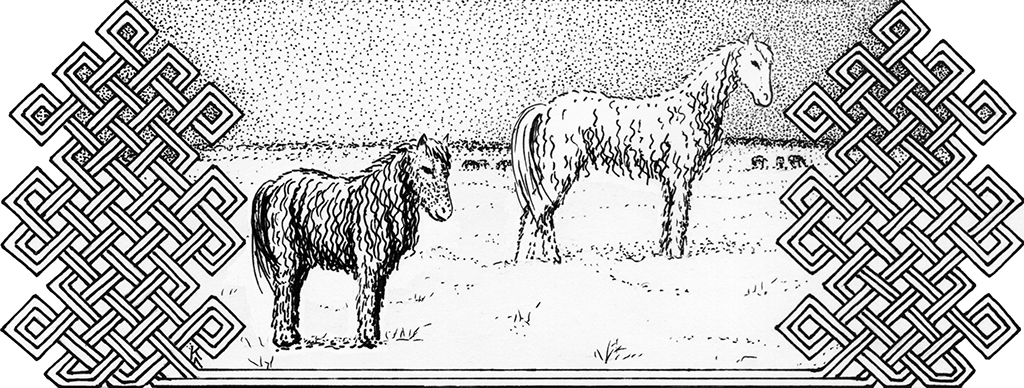 Во-вторых, они косматые. Длинные, аккуратно расчёсанные пряди спускаются со спины почти до колен и слегка кудрявятся под брюхом и шеей. Собственно, гривы как таковой у этих тварей нет, она не выделяется на фоне прочей обильной шевелюры. А хвост – ну хвост, классическая такая метёлка.