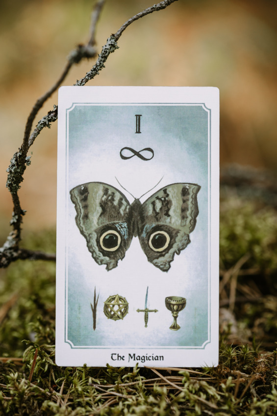 На аркане изображена Совиная бабочка – на ее крыльях два ярких пятна имитирующих глаза совы¸ для отпугивания хищников. Внизу изображены все четыре масти Таро жезлы, пентакли, мечи, кубки. Над «головой» знак бесконечности.