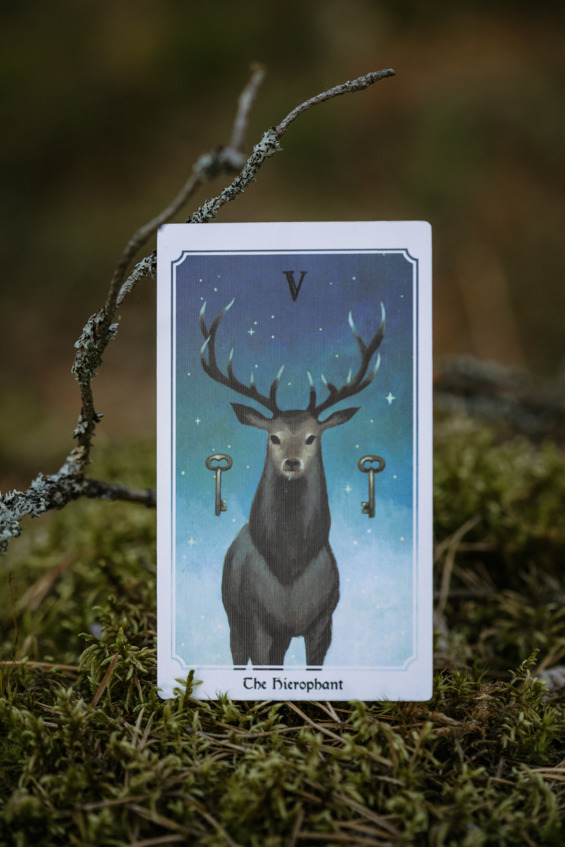 На карте изображен большой и сильный лось, у него выразительный взгляд, но он смотрит на нас с невероятной добротой и снисходительной мудростью. Власть Иерофанта не в строгости, а в доброте и мягкости.