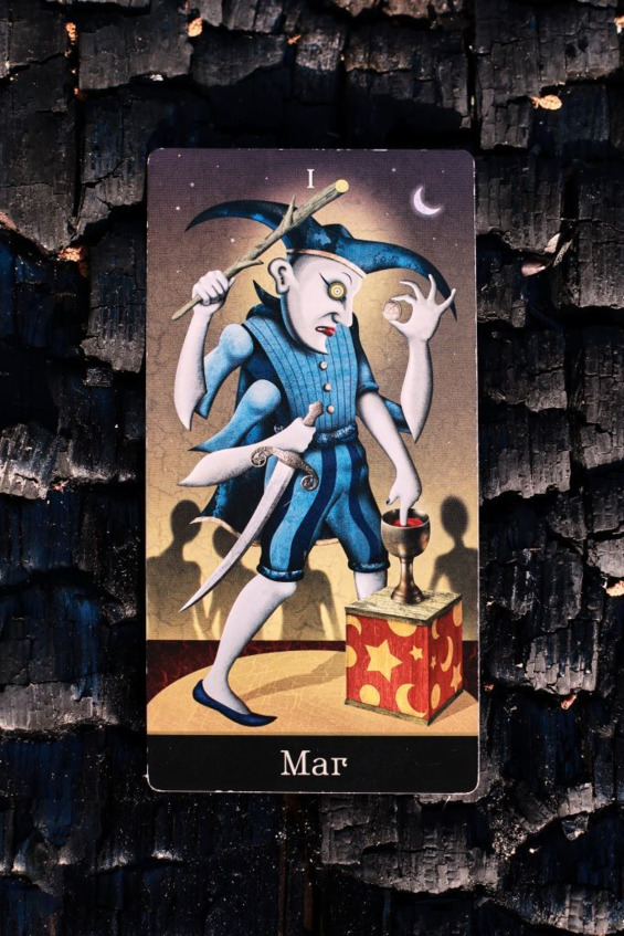Действие сюжета карты происходит в цирке – перед нами выступление Мага (а может быть, фокусника?). И опять же: у главного героя костюм в полоску и головной убор, очень похожий на шутовской колпак. Именно такая расцветка одежды была обязательной для шутов, жонглеров и других маргинальных личностей в Европе в конце Средневековья. У нашего героя четыре руки – «почетный» артист цирка уродов.