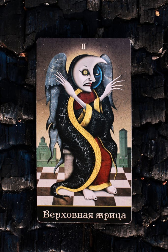 Верховная Жрица изображена с большими каменными крыльями. Возможно ли воспарить на таких? Сомневаюсь. Слишком тяжела ее ноша. Жрица обладает колоссальным количеством сакральных знаний. Но по ее закрытой позе, перекрещенным рукам на груди и черному плащу становится понятно, что она явно не торопится делиться ими с другими. Под черным плащом мы видим ярко-красные одежды, а это говорит нам об огромном внутреннем потенциале и страсти.