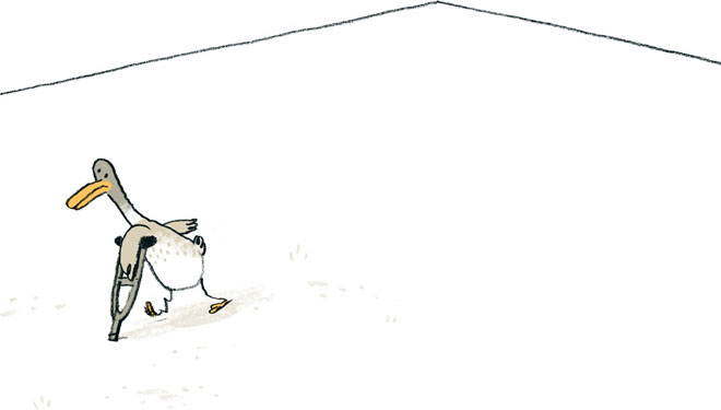 Вот утка и задумалась, а не отправиться ли ей самой путешествовать? Но её всё время что-то удерживало. Чтобы уж совсем не засиживаться, утка регулярно обходила свой двор, опираясь на костыль, всегда в полном одиночестве.