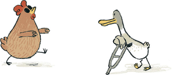 – Бедняжка, ты и впрямь хромая утка! – Курица протянула крыло и ощупала утку с головы до пят, не обойдя вниманием даже костыль. После чего потрепала её по плечу.