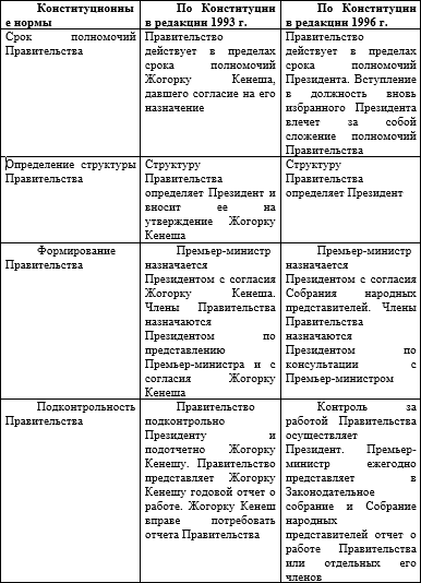 Новый статус Правительства был установлен Конституцией Кыргызской Республики, принятой 5 мая 1993 г. В развитие конституционных норм Жогорку Кенеш 27 мая 1994 г. принял Закон «О Правительстве Кыргызской Республики»[156] Это довольно развернутый документ, регулирующий все вопросы, касающиеся Правительства (один лишь перечень его полномочий содержал 34 пункта). Однако, как уже отмечалось, Конституция от 5 мая 1993 г. не выдержала проверки временем, по итогам референдума от 10 февраля 1996 г. в нее были внесены существенные дополнения и изменения; коснулись они и Правительства. Сравнительная характеристика конституционных норм о Правительстве в Конституции в редакциях 1993 и 1996 гг. представлена в табл. 1.