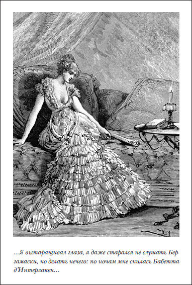 Я вытаращивал глаза, я даже старался не слушать Бергамаски, но делать нечего: по ночам мне снилась Бабетта д’Интерлакен. В полубреду я пытался изгнать фантом белокурой дьяволицы с распущенными волосами по плечам. По обнаженным, разумеется, плечам. О, сатанинский благоуханный призрак, вздымающиеся от распутного жара перси, безбожная и греховодная плоть, я вожделел ее и сочетал с ней свой дух. То есть, пронизанный ужасом от единой мысли дотронуться до нее даже кончиками пальцев, я испытывал зверское желание стать как она. В такой же степени всевластным и настолько же тайным и сильным, способным подделывать номера на паспортах и губить существ противоположного пола.