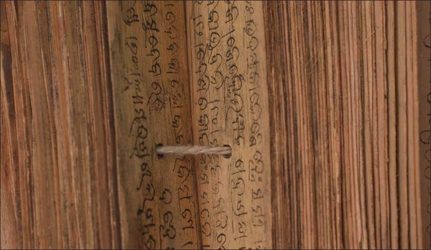 An example of a palm-leaf manuscript showing how the text is written on to palm leaves and how the bundles of leaves are joined together.