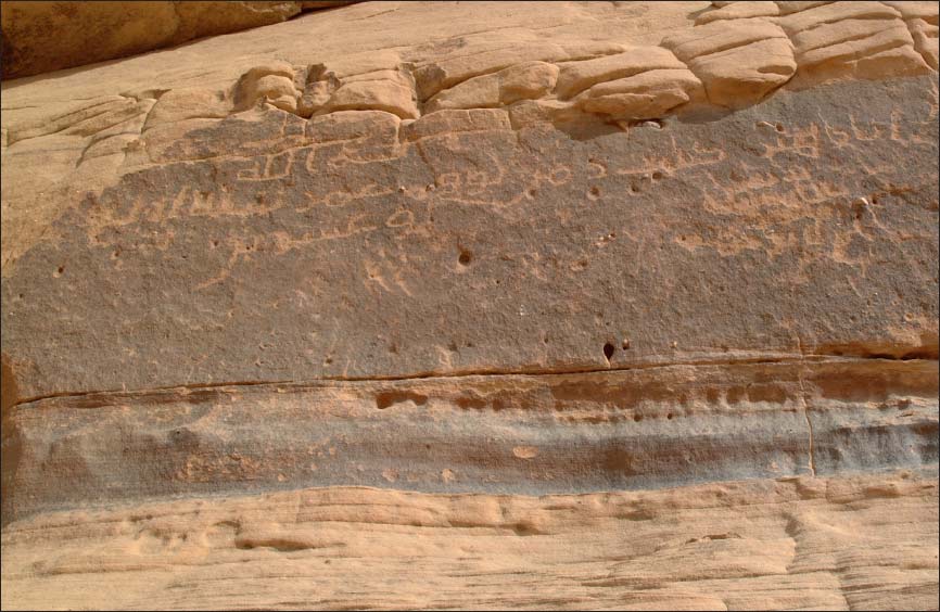 This inscription, from the 7th century AD, was carved into a block of red sandstone located south of Qa’a al Muatadil and north of Sharma in northwestern Saudi Arabia. The rock stands on an ancient trade and pilgrimage route that connected the early Islamic city of al-Mabiyat with Madain Saleh, a city known to the Romans as Hegra and which was originally part of the Nabatean kingdom in the 1st century AD, their second city after Petra. By the time the inscription was carved, Madain Saleh was on the pilgrimage route to Mecca further south.