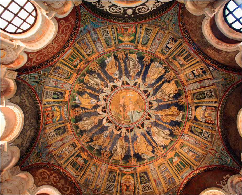 Christ’s baptism, depicted on the ceiling of King Theodoric’s Arian Baptistry in Ravenna.