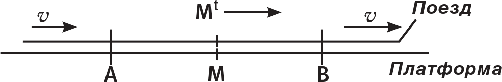Предположим, в определенный момент (с точки зрения наблюдателя, стоящего на платформе), когда молния ударяет в точки А и В, пассажир находится в середине поезда в точке Mt, которая находится как раз напротив места, где стоял наблюдатель на платформе, то есть в точке М. Если поезд покоится относительно платформы, пассажир внутри поезда увидит удары молнии одновременно, точно так же как и наблюдатель на платформе.