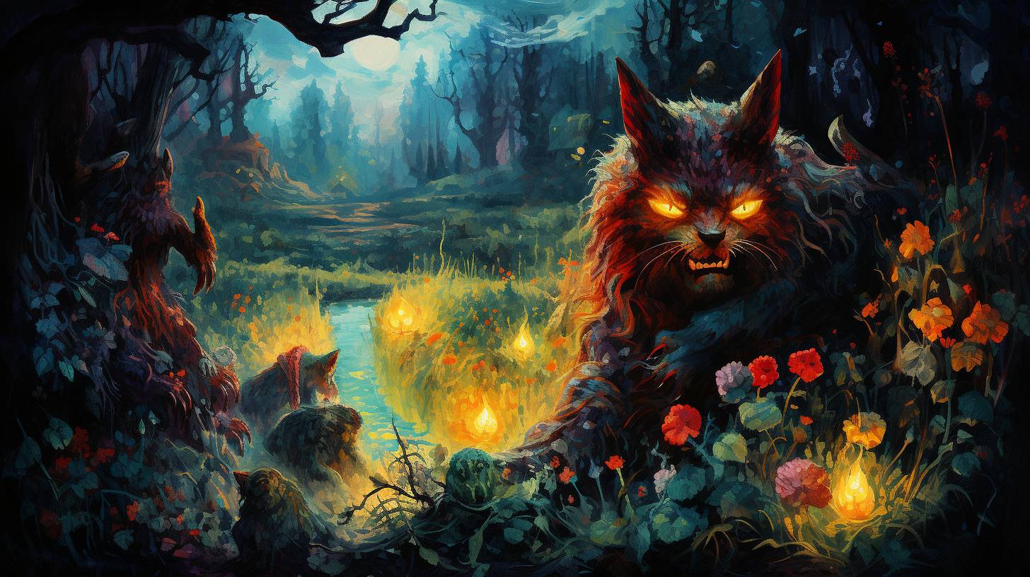 Дошёл до хором своих лесных, а там на полянке перед домом, на бревнышке, Гостята сидит, на солнышке греется, а в ногах её кот Баюн. И мурчит так, шерстяная кабаняка, что по всему лесу шум стоит, деревья качаются. Сморит девицу, упадёт же в сон. А чего это его так расплющило? Морда довольная, во все стороны усы. Вон оно что! Гостята его за ушами чешет и по спинке гладит.