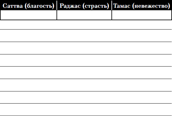 Как это сделать? Сделай три столбца, а затем вспоминай события, которые с тобой происходили: от глобальных до самых незначительных, и постарайся найти им место, определив их к одной из трех гун.