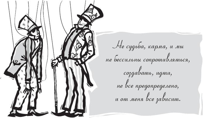 Два человека могут жить в одних условиях, учиться в одном классе, и все у них будет похожим, даже одинаковым, но один, так ничего и не добившись, тихо или шумно спивается, не увидев даже соседнего города, а у другого весь мир «в кармане». Получается, что не обстоятельства, точно, делают нас. Не судьба-карма, и мы не бессильны сопротивляться, создавать, идти, не все предопределено, и от меня все зависит. Я – не овощ, не полено, не щепка в реке, не плыву по течению и не жду, чем все закончится. То, чего я добился и добиваюсь в жизни, не кто-то написал заранее, а я не иду проторенным курсом.