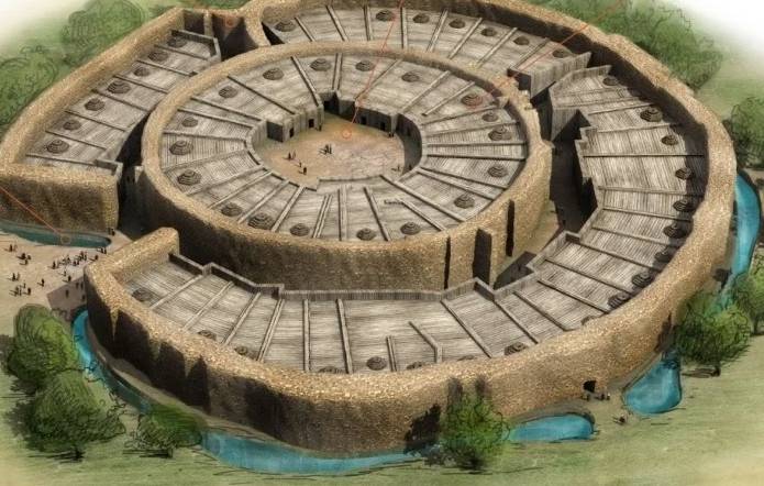 Сопряженные жилые и хозяйственные строения, ремесленные мастерские (в том числе гончарные, ткацкие и металлургические) были расположены концентрично по периметру кольцеобразных оборонительных стен. Внешняя кольцеобразная крепостная стена была шириной 5,5 метров. По крышам строений, вдоль оборонительных стен проходила улица, по которой могли передвигаться колесницы. Костные останки животных показали, что они принадлежали преимущественно лошадям и коровам. Обнаружены следы системы водоснабжения и централизованной системы водоотведения. В каждом жилище был свой колодец, погреба, очаг с системой вентиляции. Площадь жилища составляла от 50 до 200-300 квадратных метров со спальнями, кладовыми (в земляных колодцах), кухнями. Выходы строений были направлены к центру городища – к площади для собраний у главного очага.