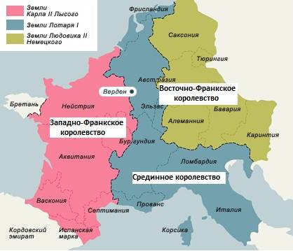 В 843 году, в Вердене сыновья Людовика I Благочестивого заключили между собой договор по разделу империи. Людовику II (позднее названному «Немецкий») отошли земли франкской империи к востоку от Рейна: Франкония, Бавария, Саксония, Тюрингия, Алемания, Восточная (Баварская) марка, Карантанская марка. Карлу II Лысому досталась Аквитания, Васкония (будущее герцогство Гасконь), Нейстрия, Испанская марка, Септимания, Бретань, Фландрия. (После смерти Пипина, сына Людовика I, его часть Аквитании была передана Карлу.) Лотарю I была отведена территория между западной частью и восточной частью королевства Людовика I, включая западную часть Австразии, Эльзас, Фризию, Прованс, Бургундию, Ломбардию, северную Италию. Таким образом, по верденскому договору 843 года были определены территории Восточно-Франкского королевства Людовика II Немецкого, Западно-Франкского королевства Карла II Лысого и Срединного королевства Лотаря I.