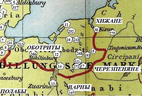 Граница оботритов карты 10 века [5]. Пятиугольниками обозначены наиболее крупные средневековые городища славян, а также их название или ближайший топоним: 11 – Рерик (Rerick), 12 – Мекленбург (Mecklenburg, Велиград), 13 – Зверин (совр. Шверин, Schwerin), 14 – Добин (Dobin), 15 – Верле (Вурле, Werle), 16 – Илов (Ilow), 17 – Большая радость (Gross Raden), 19 – Бютцов, 38 – Кессин, 213 – о. Deipsee, 221 – Groß Görnow (Большой Гёрнов, Горнов), 243 – Мадсов, 252 – Новый Буков, 266 – Роксин (Roxin), 268 – Высокий замок/ Hohe Burg, 272 – Sternberger Burg