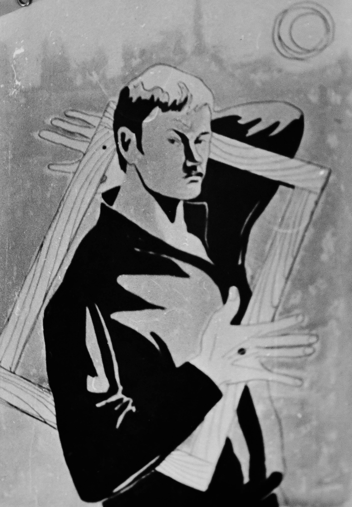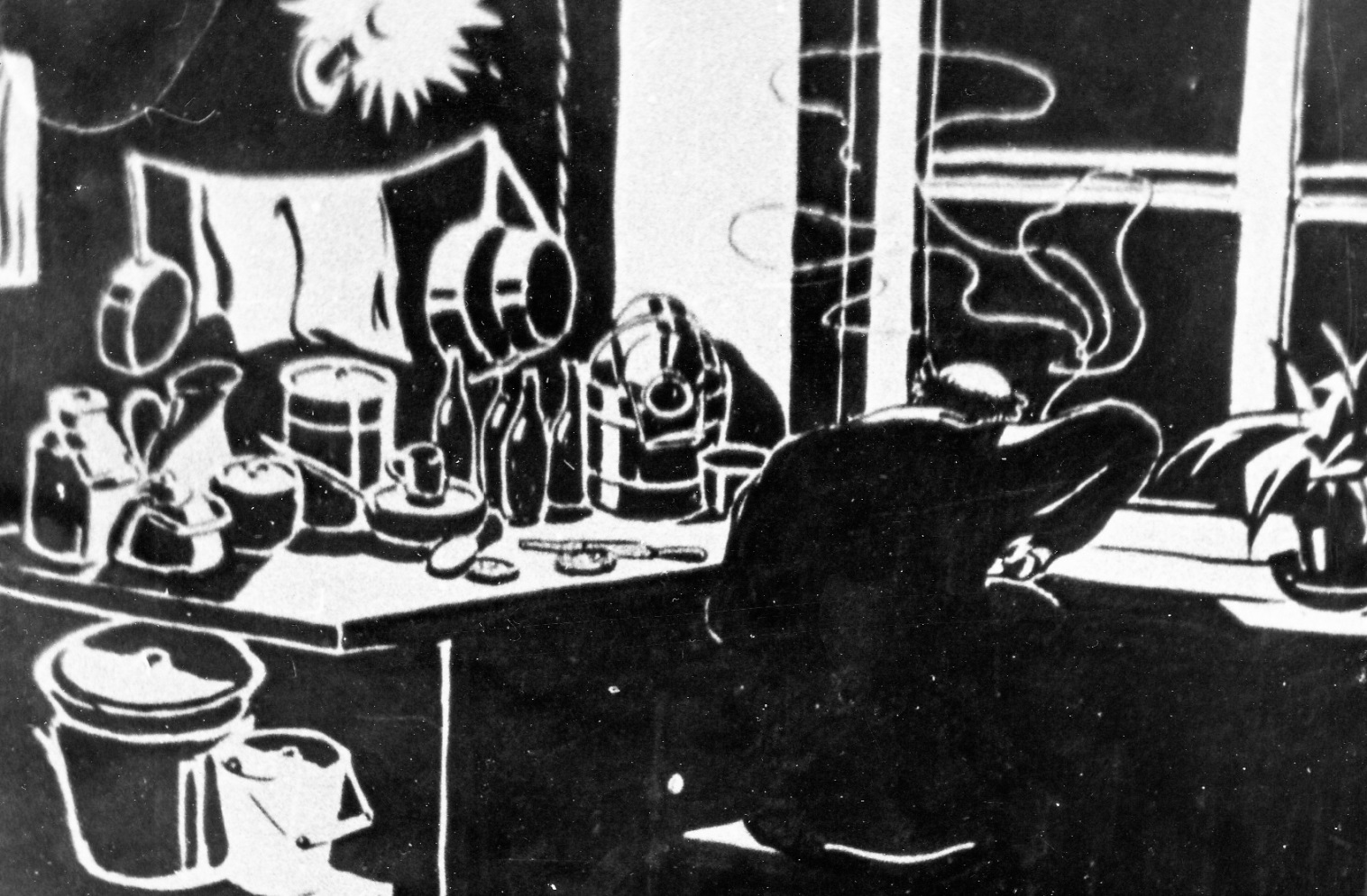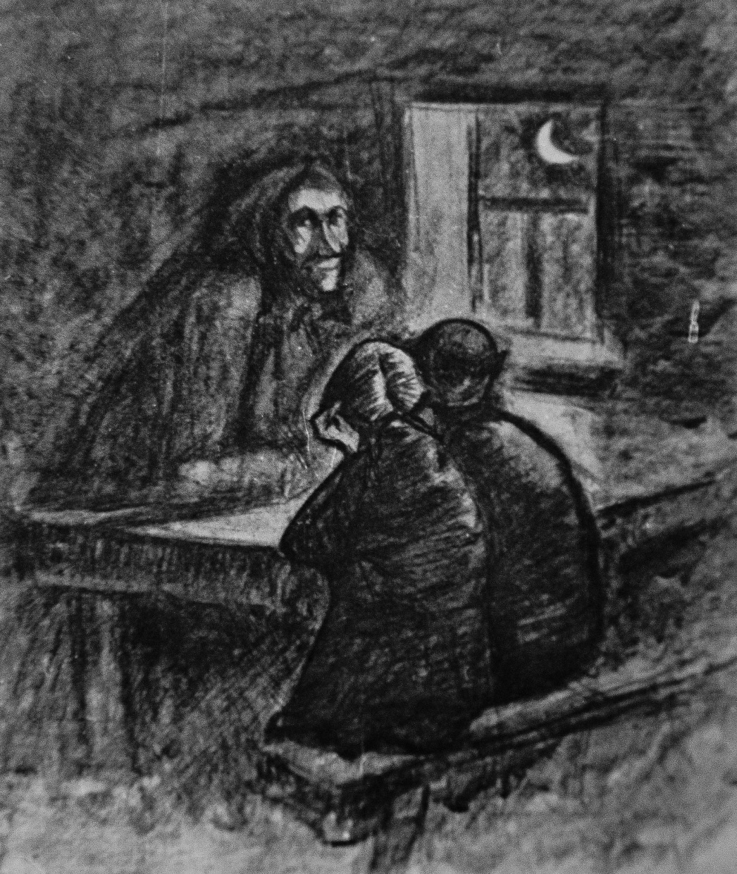 Картина «Тоска». У окна чёрный человек, почти по колено погрязший в темноте, поднимающейся от пола. Он рвётся душой туда – за окно, к красному закату от оранжево-фиолетового казарменного света.