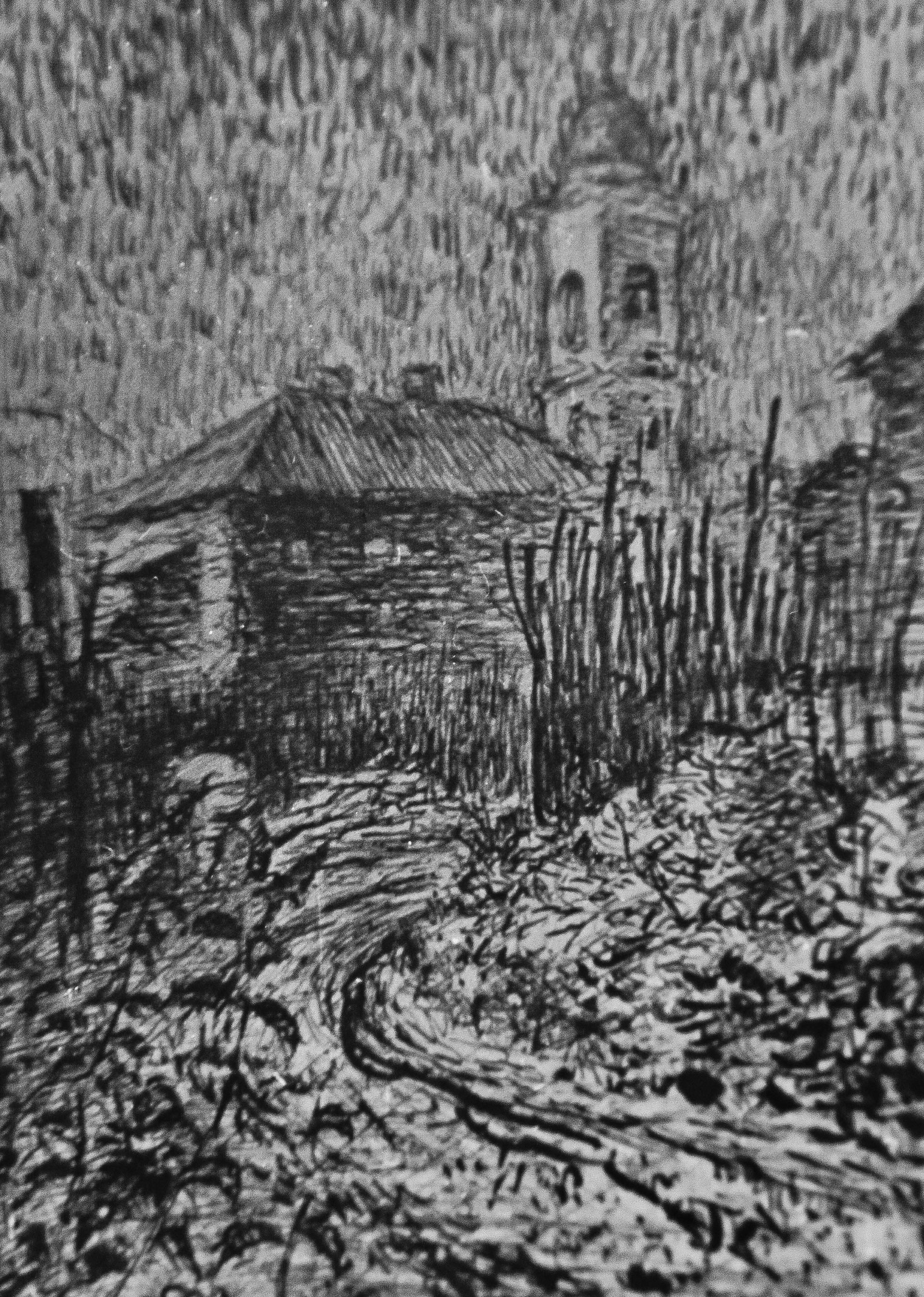 «Село Малахово». Карандаш. Картинка сделана по памяти. Полдень. Лето. Затишье. Лошадь вот-вот скроется в сарае. Пастушок сидит на столбе моста, смотрит на воду, уйдя в себя.