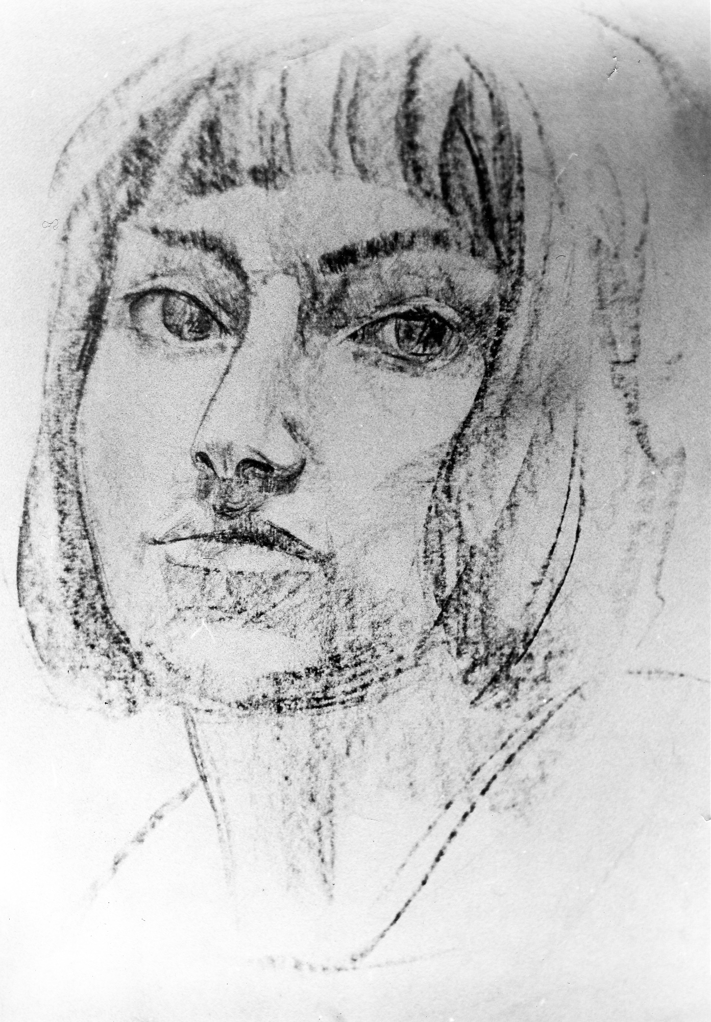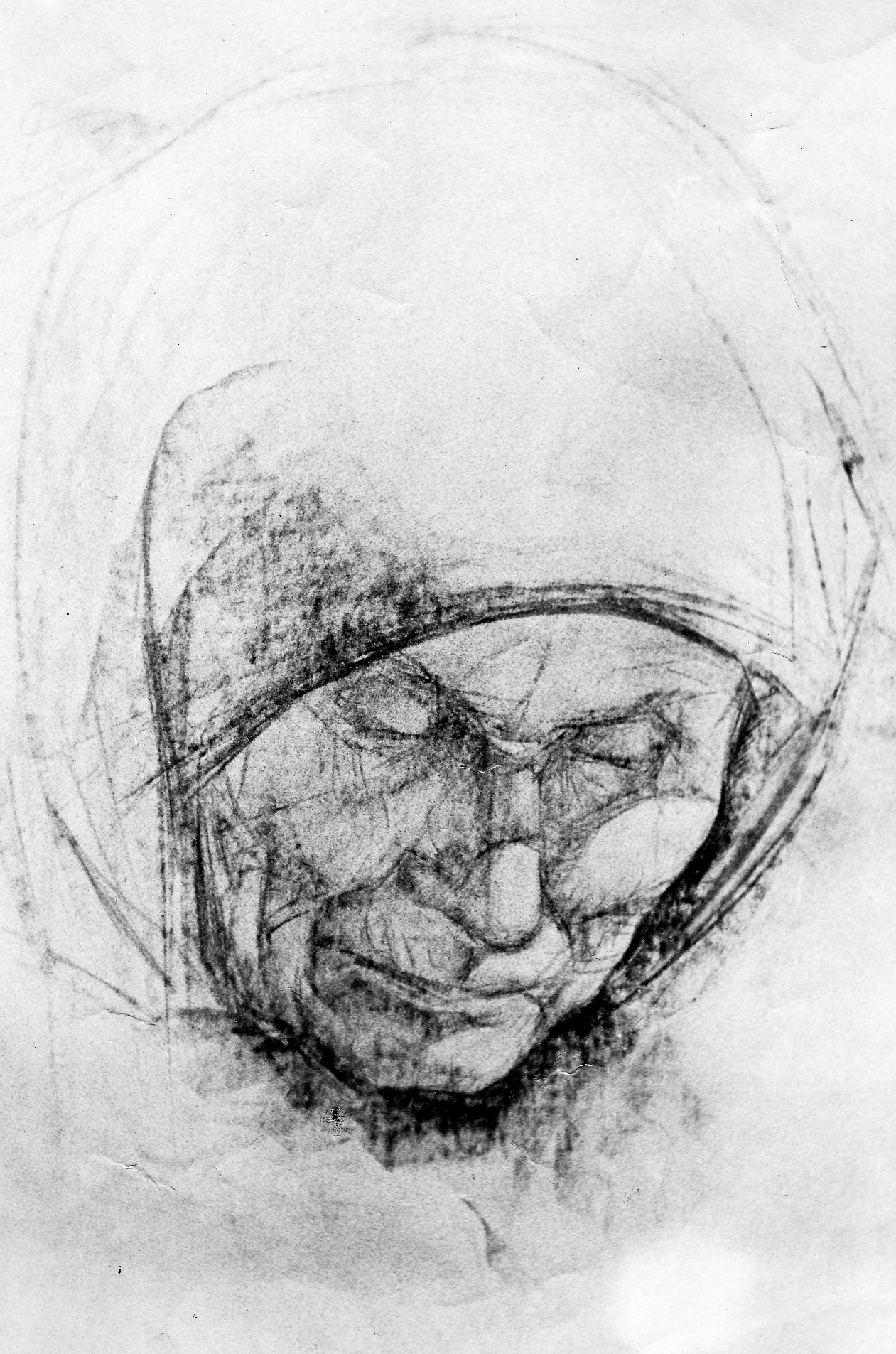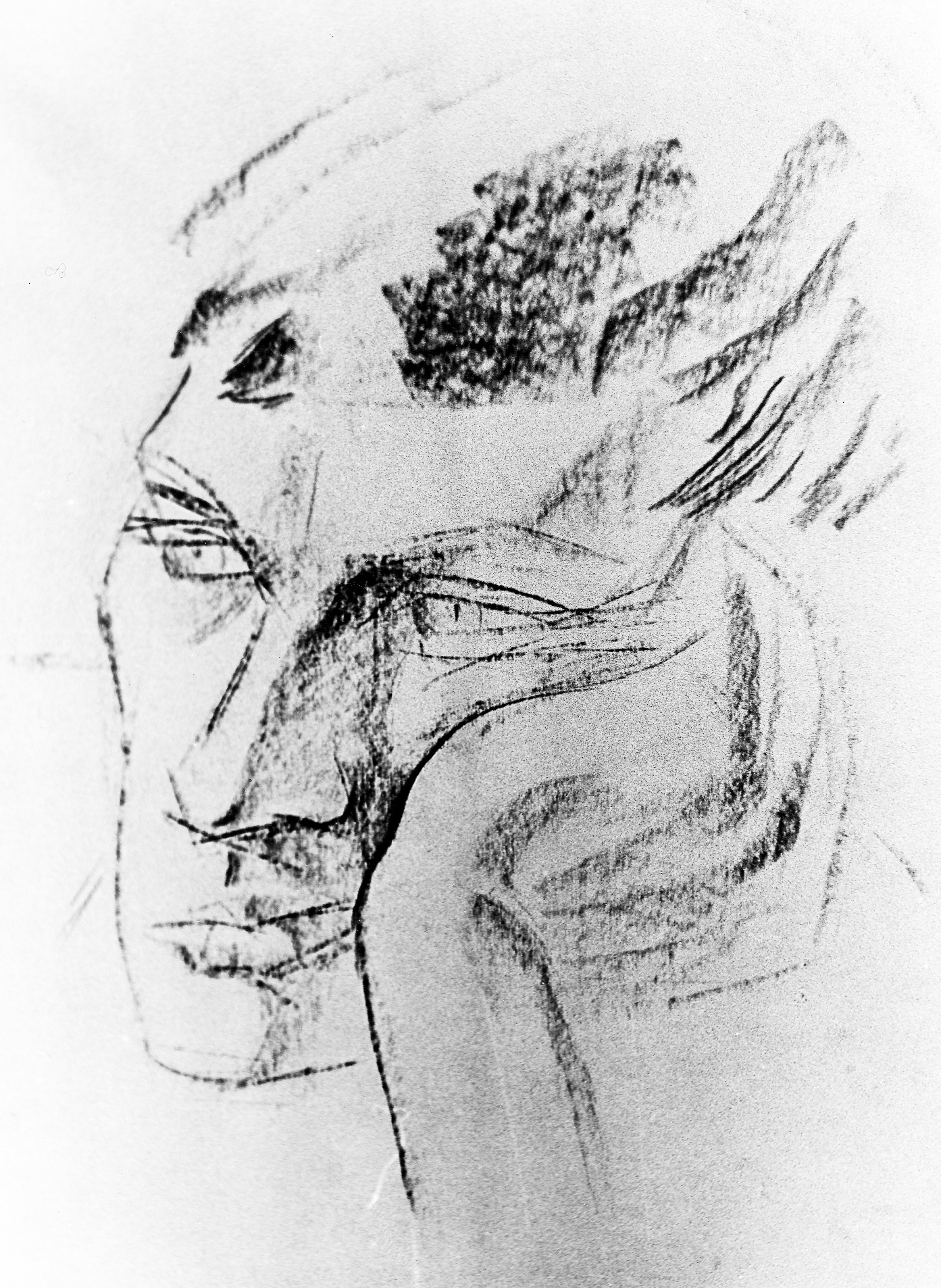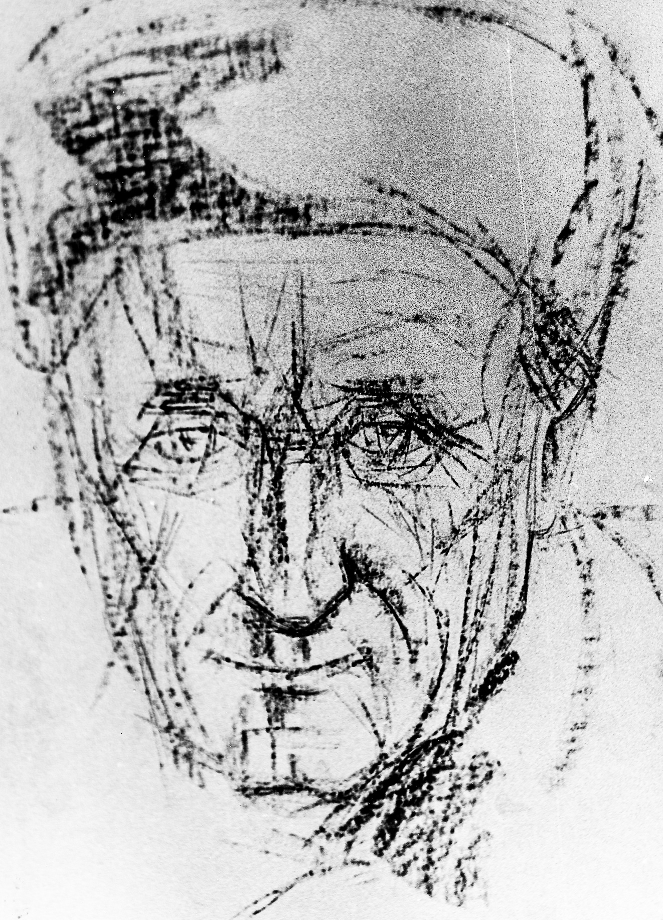 Набросок с названием «Рядовой» выполнен синим карандашом. Солдат – страдалец. Тоскливые глаза и морщины на лице. Свет лишь из окна виден ему. Лишь стороной касается его. Сам же солдат – общечеловеческая ненужность. Осатанелость и отупение. Мир должен быть на земле, а не солдаты, не солдаты в казармах.