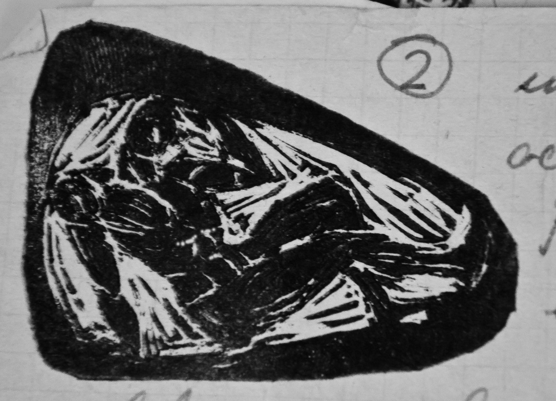 Письмо украшалось несколькими линогравюрками. На одной из них сидит, прижав руками колени к груди, существо с фигурой человека, с собачьей ушастой головой, взирающей на звёздное небо…