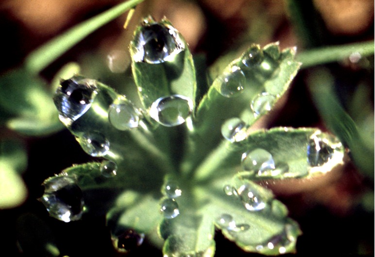 …И увидел переплетение гладких светло-зеленых стволов, удлиненных тропических листьев, увешанных десятками голубоватых алмазов. То тут, то там ослепительно вспыхивали радуги. В беспорядочном хаосе желтым уютным островком светилась глянцевитая чашечка лютика. Миниатюрная глазастая мошка соблазнилась уютом, села на лепесток, но, обмочив в кристальной воде свои мохнатые лапки, тотчас взлетела… Каждая капля действительно отражала весь мир, но больше всего она отражала солнце и небо. Особенно живописными были те, которые лежали в углублениях листьев, – тяжелые, льдисто-объемные, невиданно крупные драгоценности, круглящиеся в зеленоватой оправе.