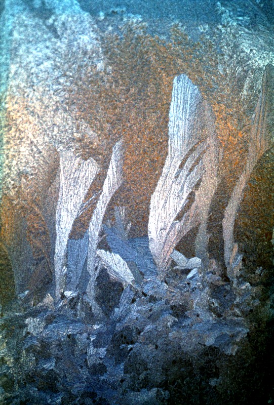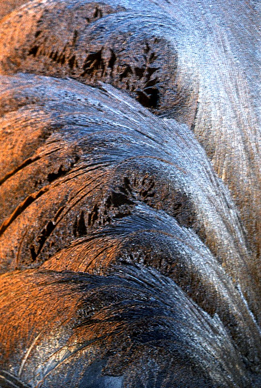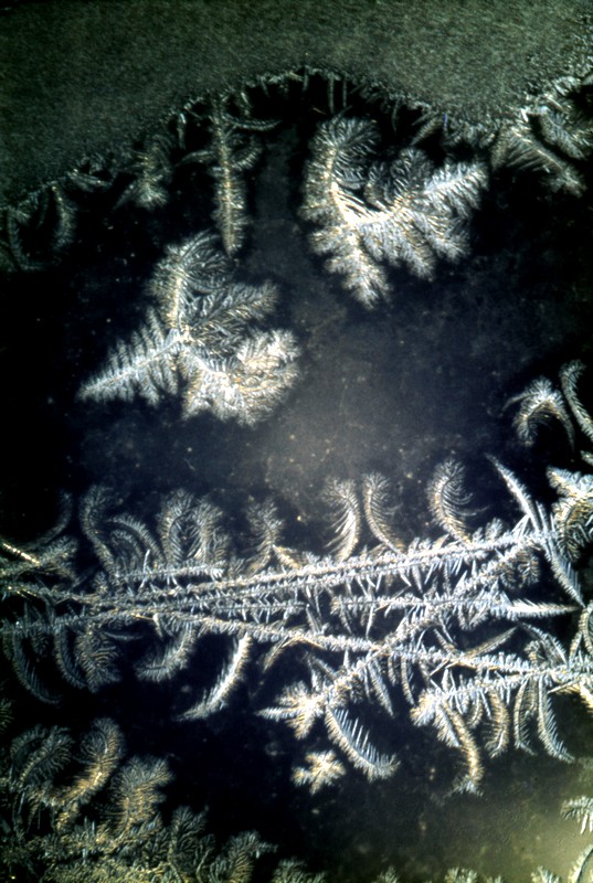 Чуть позже ошеломили меня морозные узоры на стеклах окон, когда я принялся фотографировать их крупным планом. Так можно было совершать захватывающие «путешествия», уже не выходя из стен квартиры. Удивительная форма этих мелких кристаллов воды, их оттенок, зависящий и от положения солнца, и от рефлексов, идущих от стен домов, и от голубизны неба, навевали сказочные ассоциации. Ошеломляли не только гармония и красота узоров, но и то, что кристаллики, группируясь, составляли нечто похожее на травинки, листья, даже на тропические дремучие заросли. «Джунгли» на стекле! Только необитаемые… У меня возникла фантазия, объясняющая форму этих узоров: зимой вода как бы «вспоминает» о лете – о том, что она входила в состав листьев деревьев и трав…