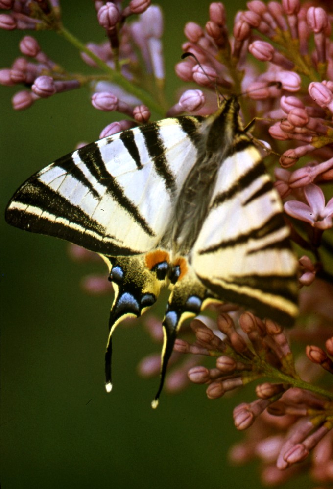 В общей сложности я провел рядом с Подалирием около двух часов. Наконец-то рассмотрел его как следует. Толстое обтекаемое тельце с продольными черными и белыми полосами напоминает тело дельфина. Однако, снятый с приподнятыми крыльями на сиреневых цветах в определенном ракурсе – снизу и сбоку, он кажется парусным фрегатом, несущимся по пенистым сиреневым волнам. Паруса-крылья светло-желтые, с поперечными темными полосками и темной каймой. Они своеобразно вырезаны – угловато и резко. На заднем конце задних крыльев – синие проблески на темной кайме и два синих пятна, сверху окаймленные широкими ярко-оранжевыми полосками: бирюзовые «глаза» с пшеничными «бровями». И все-таки самое оригинальное, самое любопытное и непонятное – это, пожалуй, две шпоры, скорее даже косицы: тонкие, длинные, со светлыми кончиками. Они элегантно с непонятной целью перевиты. Облик бабочки создает ощущение своеобразной, «породистой» красоты и стремительности. Однажды в электричке я увидел броское, очень красивое женское лицо: смуглое, худое, слегка скуластое, с большими ярко-голубыми глазами и тонкими черными бровями, резко изломанными. Поразительно выделяясь в толпе, оно казалось нездешним, не от мира сего, хотя одета была женщина довольно обычно… Фотографируя теперь Подалирия, я вспомнил о ней.