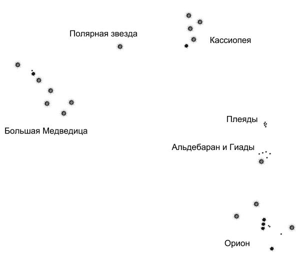 Первое, что увидел Данте, выйдя из ада, были звезды («E quindi uscimmo a riveder le stelle»). Однако наши современники если и знают о звездах, то в основном из книг или Интернета – при электрическом освещении рассмотреть на ночном небе что-нибудь, кроме луны, невозможно. Однако и в безлюдной степи или тундре, где звезды видны прекрасно, неподготовленный человек заметит над собой лишь хаотически разбросанные светлые точки. Но когда глаз привыкнет, три астральных объекта будут, вероятно, выделены среди остальных. Не заметить их практически невозможно. Это ковш Большой Медведицы, Орион (или Пояс Ориона) и Плеяды. Четвертым окажется Млечный Путь.