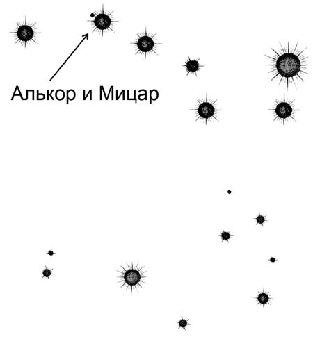 Согласно греческой традиции, свет Меропы померк из-за того, что она вышла замуж за смертного, тогда как остальные Плеяды стали женами богов59. В других традициях Старого Света отделившаяся от сестер-Плеяд девушка отождествляется с Алькором – слабой звездочкой рядом с Мицаром, т. е. второй звездой ручки ковша Большой Медведицы (рис. 2).