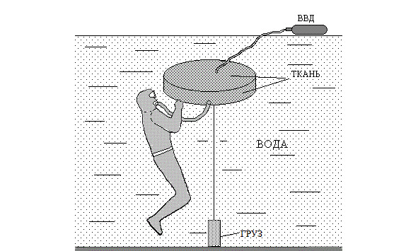 Испытатель через загубник с патрубком, соединенным с полой камерой объемом около 100 л, образованной путем обтяжки смоченной водой хлопчатобумажной тканью двух колец диаметром по 800 мм с размером сквозных пор до 100 мкм при расстоянии между кольцами 200 мм, опускался под воду на глубину от 0,3 до 1,5 м (рис. 1). Давление внутри камеры было на 30—50 мм водяного столба больше суммарного давления атмосферы и гидростатического столба, которое изменялось от 1,03 до 1,15 ата. При опускании камеры в воду к ней подвешивался груз для преодоления выталкивающей силы воды. При этом дыхание осуществлялось только воздухом, находящимся внутри камеры. Выдох осуществлялся также внутрь камеры. Время, проведенное испытателем под водой, составляло 50 мин. Вдох и выдох через камеру осуществлялся без заметных усилий.