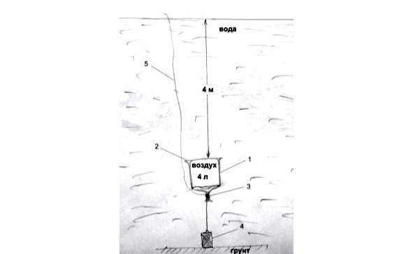 После погружения газогенератора под воду на глубину 4 м, за счёт обжатия, воздух, находившейся в полиэтиленовой плёнке поднялся в понтон и заполнил его на объём 0,4 – 0,5л.