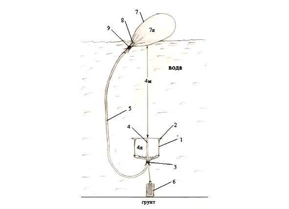 1 – прочная ёмкость; 2 – полиэтиленовая плёнка; 3 – резиновый жгут; 4 – металлическая трубка; 5 – гибкий шланг; 6 – груз; 7 – мягкая ёмкость; 8 – металлическая трубка; 9 – резиновый жгут.