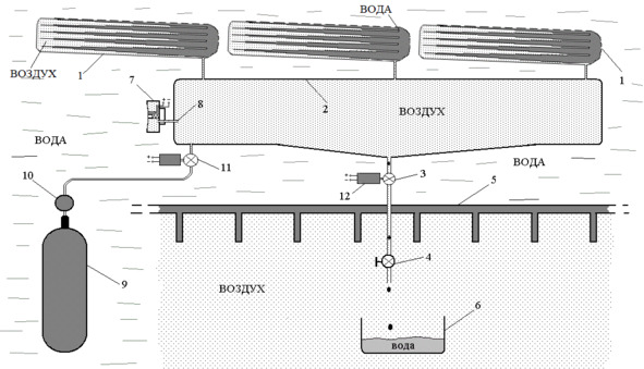 Цифрами обозначены: 1 – газогенератор; 2 – ёмкость для воздуха; 3 – электроклапан; 4 – ручной вентиль; 5 – прочный корпус МПЛ; 6 – ёмкость для сбора пресной воды; 7 – автомат контроля давления; 8 – трубка; 9 – баллон ВВД; 10 – редуктор; 11 – электроклапан; 12 – соленоид привода электроклапана.