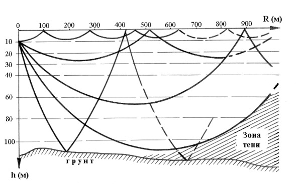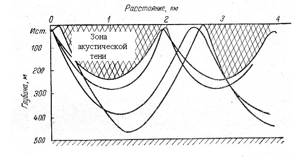 1.1.1. Изменение скорости звука в слоях воды с разной глубиной из-за разности температур приводит к искривлению (), звуковых лучей, что влияет на дальность действия гидроакустических приборов. При искривлении лучей в сторону дна (отрицательная рефракция) дальность действия гидроакустических приборов резко снижается. Определяется она верхним звуковым лучом, скользящим по поверхности воды и уходящим вглубь. Поэтому возникает зона акустической тени на малых глубинах. рефракции