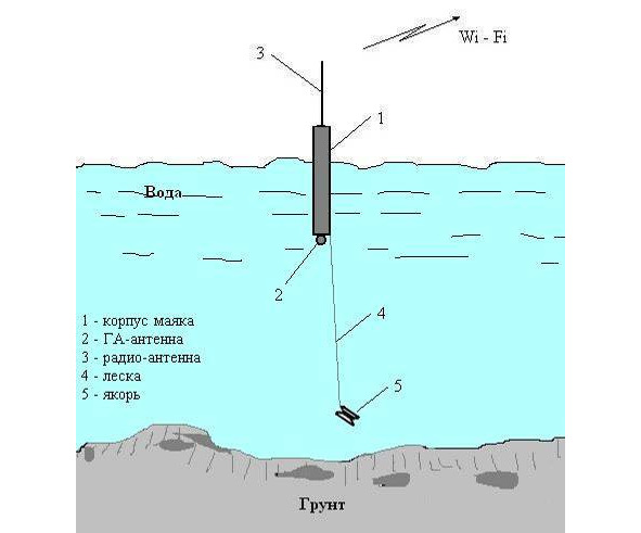 Антенна может подниматься над водой рукой водолаза при подвсплытии или пенопластовым буйком, соединённым гибким кабелем с приёмной аппаратурой, при движении водолаза на ПСД. Возможна связь водолазов с береговыми службами с помощью радио-гидроакустического маяка (рис. 3).