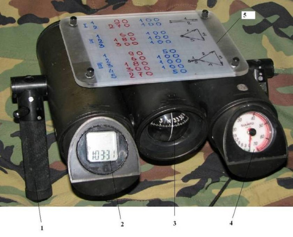 Цифрами на рисунке обозначены: 1 – прибор НПВ-2; 2 – магнитный компас «Дружба»; 3 – часы «Восток-амфибия»; 4 – глубиномер Г-5; 5 – индикатор скорости и дистанции; 6 – место для плёночного планшета.