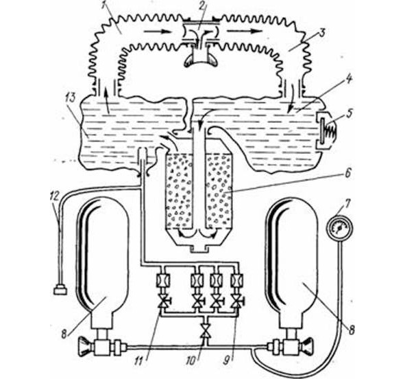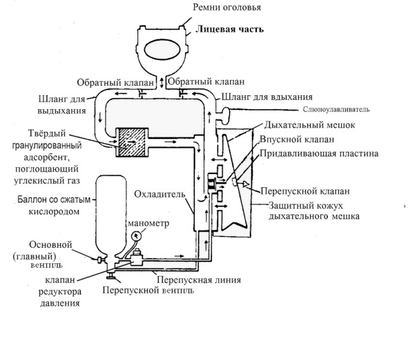 Рис. 4. Принципиальная схема дыхательного аппарата замкнутого цикла.