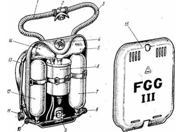 Рис. 9. Автономный дыхательный аппарат FGG III: 1 – трубка вдоха: 2 – клапанная коробка с загубником; 3 – трубка выдоха; 4 – травящий клапан; 5 – мешок выдоха; б – коробка химпоглотителя; 7 и 12 – газовые баллоны: 8 и 10 – запорные вентили; 9 – клапанное устройство; 11 – манометр; 13 – плечевой ремень; 14 – мешок вдоха; I5 – крышка.