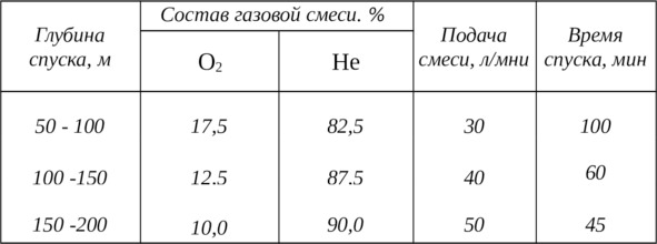 В зависимости от глубины спуска предусматривается использование трех газовых смесей, которыми предварительно заряжаются газовые баллоны и которые в соответствующих дозах подаются в систему аппарата. Данные по составу смесей, дозах подачи и допустимого времени пребывания на глубине приведены в табл. 3.1. Приведенные в таблице величины подачи газовой смеси даны в пересчете на нормальное давление.