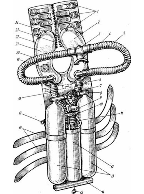 1 – пряжки; 2 – мешок вдоха; 7 – клапанная коробка; 4 – загубник; 5 – трубка вдоха: 6 – соединительная трубка; 7 – запорный вентиль; 8 – тройник; 9 – редуктор; 10 – блок дозировки; 11 – трубка подачки газа; 12 – коробка поглотителя; 13 – газовые баллоны; 14 – панель; 15 и 17 – кольца: 16 – ремни; 18 – соединительная трубка выдоха; 19 – травящий клапан; 20 – трубка выдоха; 21- мешок выдоха; 22 – подкладка; 23- застежка типа «молния»; 24 – спускная пробка.