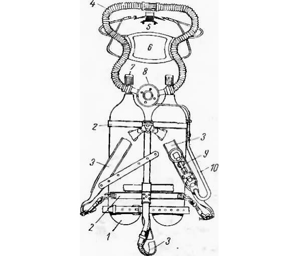 1 – стальные баллоны со сжатым до 150 атм воздухом; 2 -бугель крепления баллонов; 3 – ремнн; 4 – шланги; 5 – загубник; 6 – наголовник для удержания загубника; 7 – запорные вентили баллонов; 8 — дыхательный автомат с редуктором; 9 – манометр, показывающий давление в баллонах; 10 – гибкий шланг подачи воздуха на манометр.